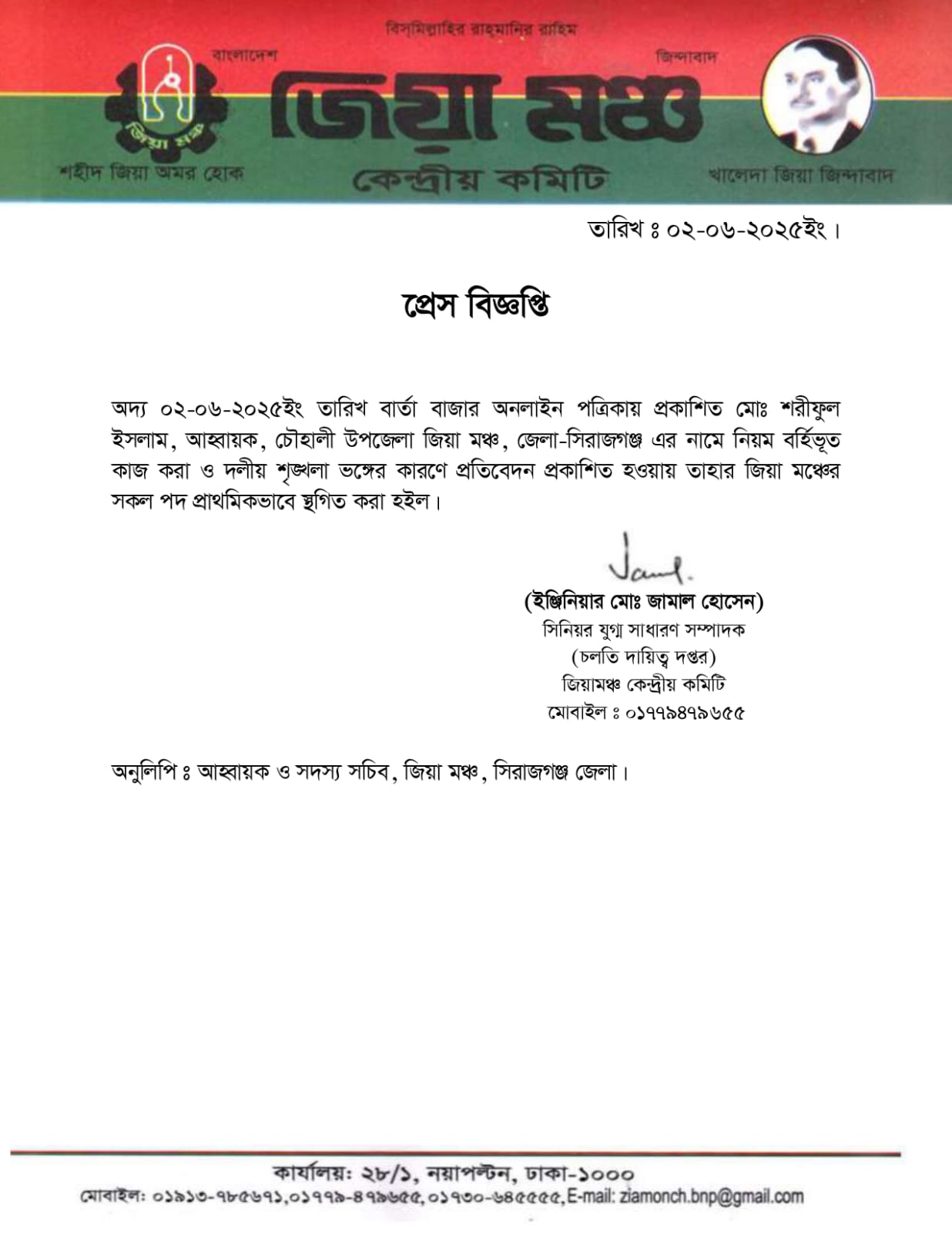 আল ইমরান মনু, সিরাজগঞ্জ প্রতিনিধিঃ দলীয় শৃঙ্খলা ভঙ্গের অভিযোগে জিয়া মঞ্চের চৌহালী উপজেলা শাখার আহ্বায়ক মো. শরিফুল ইসলাম এর সকল
