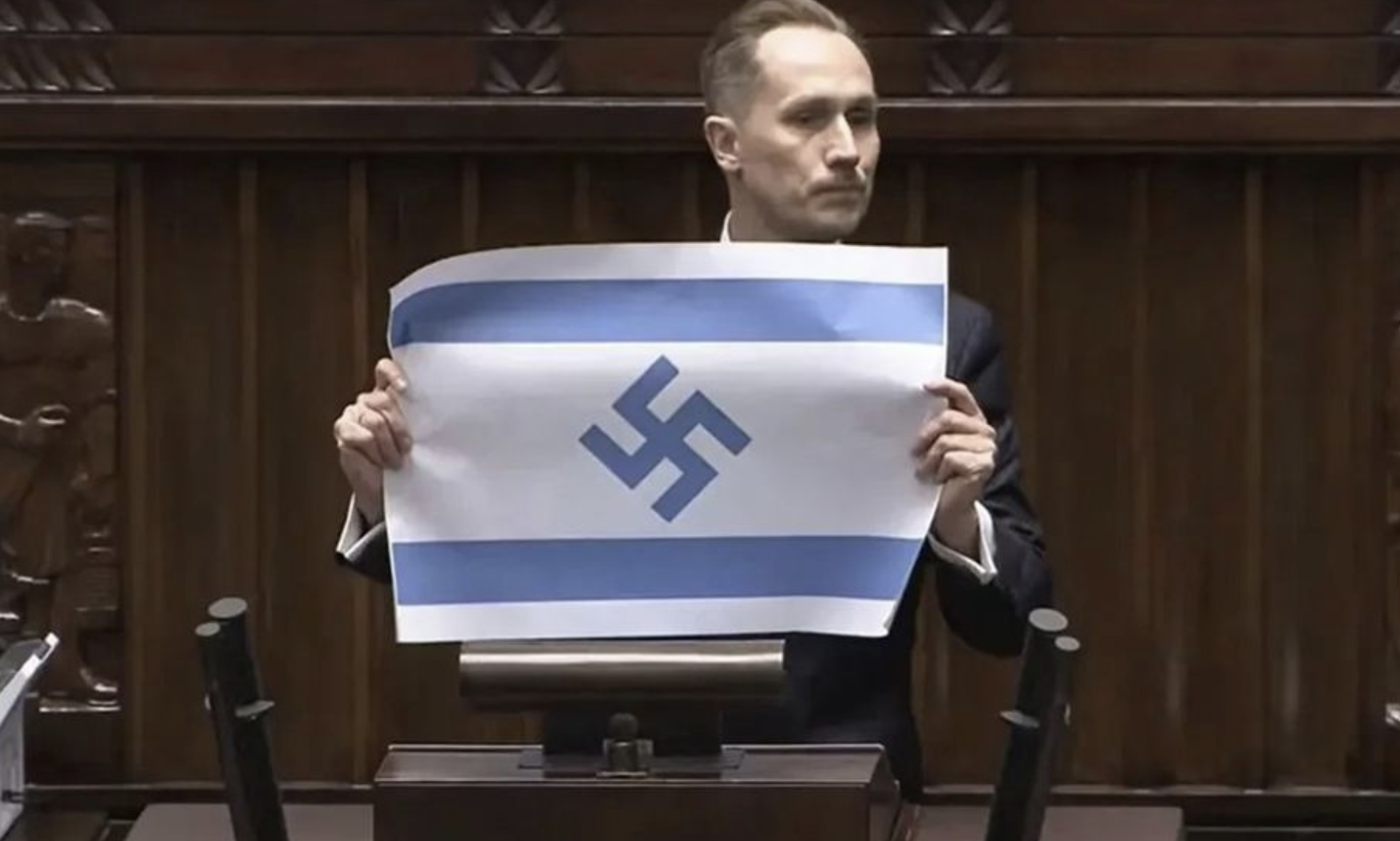 পোলিশ পার্লামেন্টে ইসরায়েলি পতাকায় নাৎসিদের স্বস্তিকা প্রতীক দেখিয়ে সংসদ সদস্যের প্রতিবাদ
